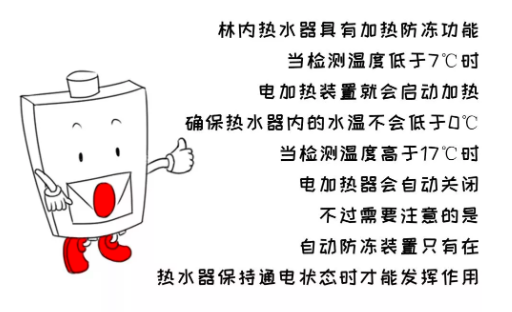 當室外溫度下降到-15℃以下,或雖未下降到-15℃以下,但伴有強風等其他自然因素時,熱水器的電加熱防凍能力可能不足,也可以使用這個方式防凍。